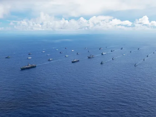 Joi, 28 iulie, 37 de nave și două submarine aparținând forțelor multinaționale au luat parte la o impresionantă ședință foto de grup în timpul exercițiului anual Rim of the Pacific, lângă Insulele Hawaii. La exerciții au participat, însă, mai multe forțe militare.
