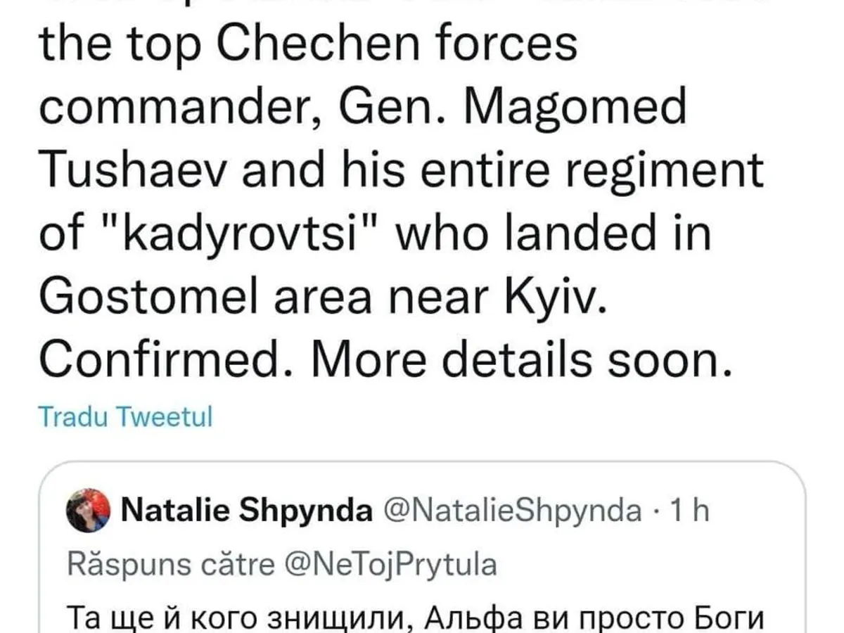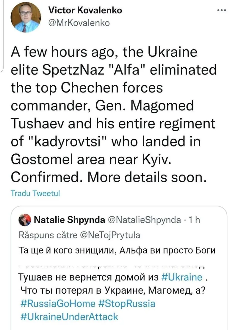 Grupul Alpha de elită din Ucraina a dus o luptă crâncenă cu mercenari cecenii pe un aeroport din apropiere de Kiev. Armata ucraineană l-a eliminat pe generalul cecen Magomed Tushaiev și pe întreaga sa echipă de luptători. Cecenii au venit în Ucraina ca să sprijine invazia rusă din Cecenia.