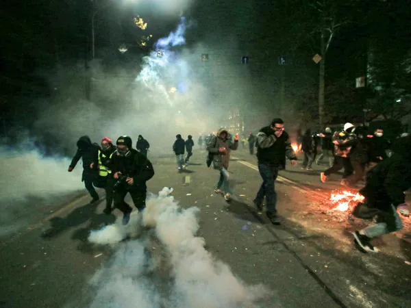 Poliţişti mascaţi, în echipament antirevoltă, au tras gloanţe de cauciuc, gaze lacrimogene şi au folosit tunuri cu apă pentru a dispersa manifestanţii care aruncau artificii, potrivit unui jurnalist al AFP care a văzut flăcări în spatele unei ferestre a clădirii.