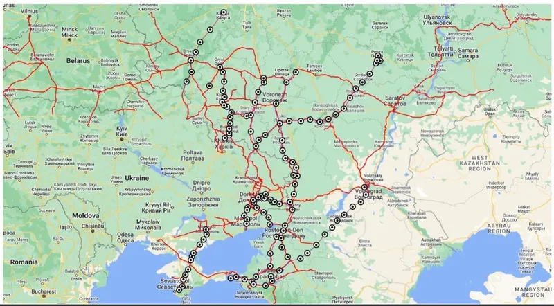 Harta stațiilor feroviare rusești din apropierea Ucrainei, publicate online. Ținte „sigure” . Locațiile tuturor stațiilor și substațiilor de cale ferată la o distanță de 250 km de granița cu Ucraina au fost publicate online.