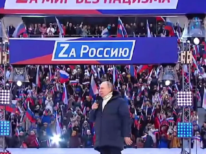 Vladimir Putin participă la un mare concert pe un stadion din Moscova unde propagă fake news și minciuni despre invazia brutală din Ucraina. În acest timp, armata rusă devastează orașe și omoară civili.