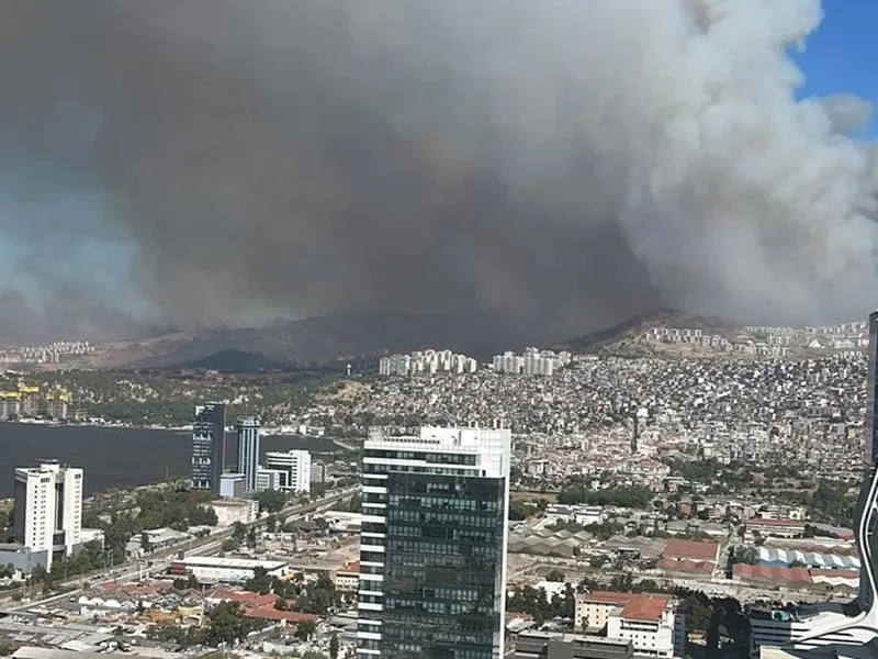 Imaginile făcute publice au arătat flăcări care au cuprins suprafețe de teren, apropiindu-se de clădiri de apartamente și drumuri din Karșıyaka, cu fum de culoare deasupra pădurilor și a orașului.