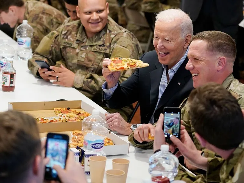 Preşedintele american a mâncat pizza împreună cu militari din Divizia 82 Aeropurtată a SUA, desfăşuraţi în Polonia pentru a consolida flancul estic al NATO după invazia Rusiei în Ucraina.