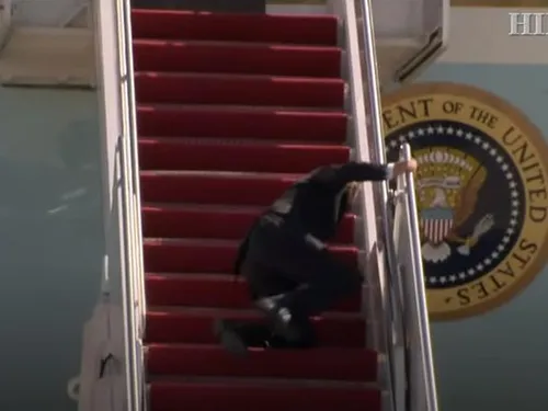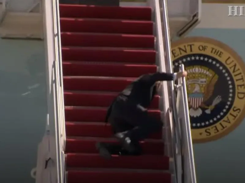Ajuns la jumătatea scării avionului prezidențial, Joe Biden s-a împiedicat de două ori, căzând în genunchi, înainte de a se prinde cu mâna dreaptă de balustradă.