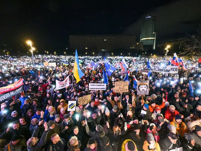O manifestație uriașă pro-UE și NATO a avut loc vineri, 10 ianuarie 2025, în capitala Slovaciei. Circa 15.000 de oameni l-au acuzat pe premierul Robert Fico că târăște țara spre Rusia.