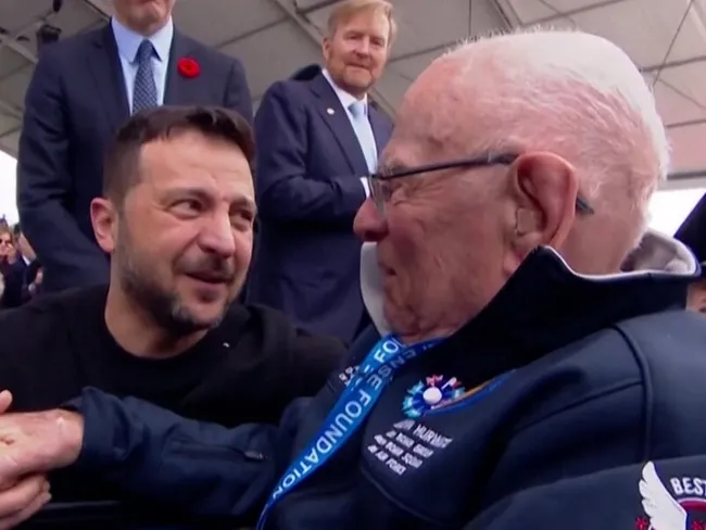 Președintele Ucrainei, Volodimir Zelenski, a împărtășit un moment emoționant cu un veteran al celui de-al Doilea Război Mondial în timpul unei ceremonii de comemorare a 80 de ani de la Ziua Z.