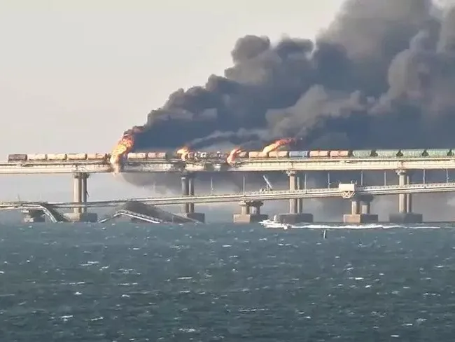 „La ora șase și șapte minute, pe partea auto a podului Crimeea dinspre partea peninsulei Taman, un camion a fost aruncat în aer, ceea ce a dus la aprinderea a șapte cisterne de combustibil ale unei garnituri de tren care se îndrepta spre peninsula Crimeea", se arată în raport.
