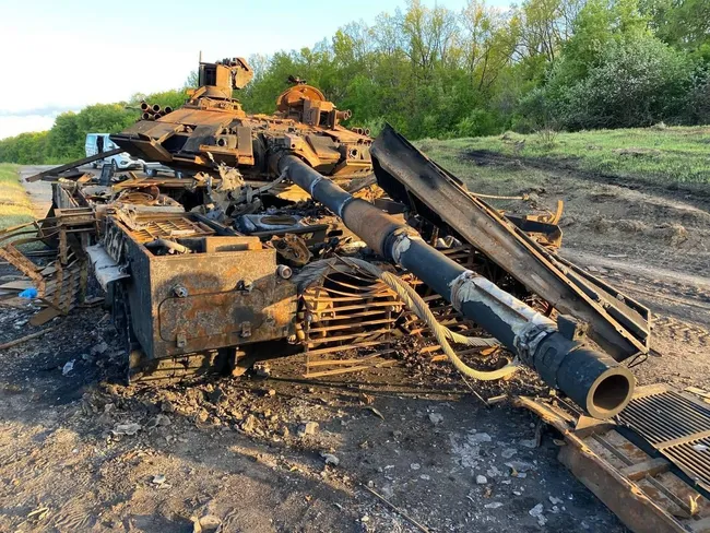 #Ukraine: The complete annihilation of a Russian tank (apparently, T-80BVM). Little is left.