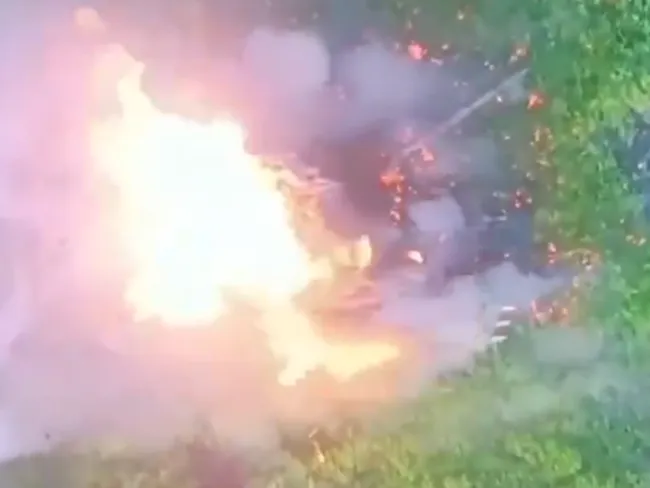 Înregistrarea video de la camera dronei arată mai întâi o lovitură directă asupra tancului, apoi o filmare de la înălțime în care tancul explodează spectaculos.