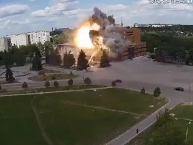Şeful statului ucrainean şi-a însoţit mesajul cu o înregistrare video care arată o explozie puternică pulverizând clădirea într-un val de fum, în timp ce două maşini treceau pe lângă, una încercând apoi să fugă din zonă.