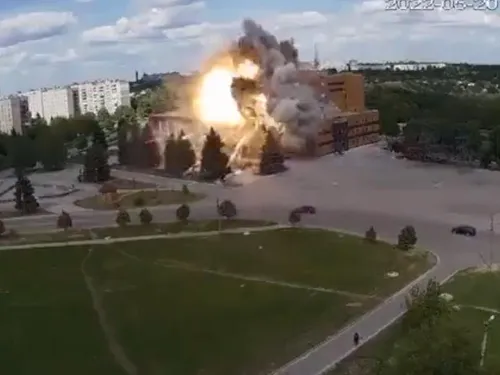 VIDEO Momentul în care o rachetă rusească distruge centrul cultural din Lozova abia reconstruit