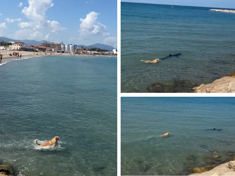 VIDEO Momentul în care un câine sare în apă să muște de coadă un rechin ce dădea târcoale turiștilor