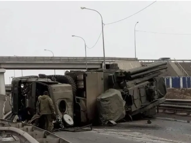 Imaginile video surprinse de camerele de supraveghere, pe care Rusia se străduiește să le blocheze, dezvăluie momentul în care Panțîr-S1, după ce a traversat podul, a deviat brusc din cursă și s-a răsturnat pe șosea, potrivit defence-blog.com.
