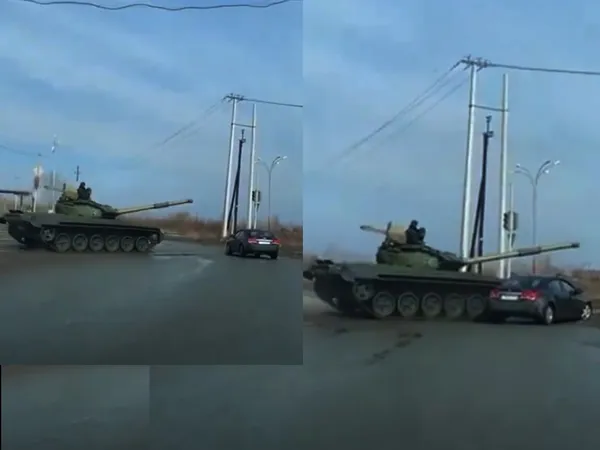 Un clip de venit viral circulă pe Internet. În el se vede cum un tanc iese de pe un drum lăturalnic și se înfinge direct într-o mașină care circula regulamentar.