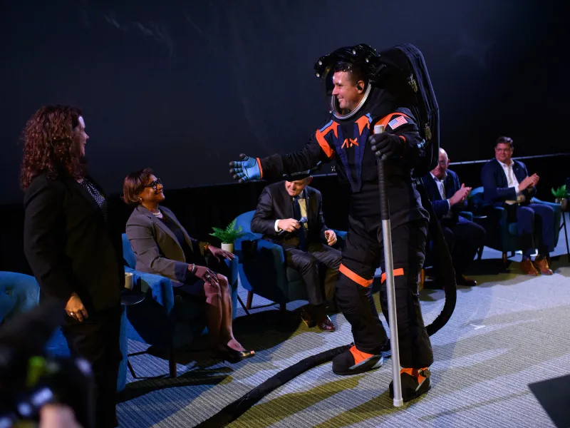 Gri cărbune, cu detalii portocalii și albastre în prototip, unitatea de mobilitate extravehiculară Axiom, sau AxEMU, este și elegantă, dar este un costum capabil să protejeze astronauții de vidul înghețat al spațiului.