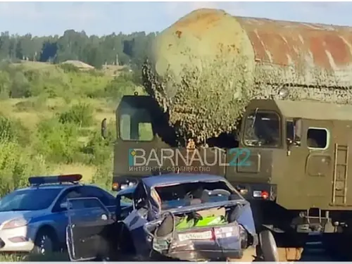 O imagine apărută pe rețelele de socializare arată un grav accident de mașină în care au fost implicate un vehicul rusesc masiv de tip transportor-erector-lansator de rachete balistice intercontinentale și un autoturism.