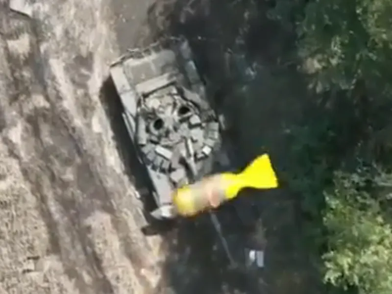 VIDEO O dronă ucraineană a aruncat o bombă exact printr-un orificiu deschis al unui tanc rusesc