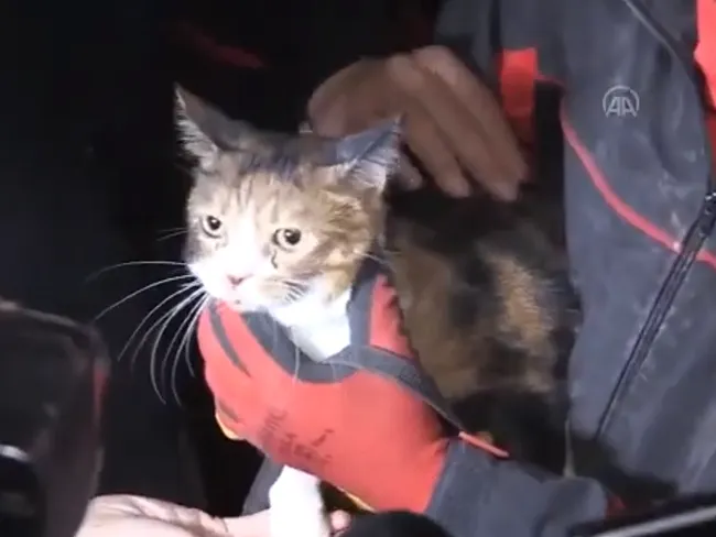 Câinele Asociației pentru Căutare și Salvare din Turcia a descoperit pisica în timp ce cerceta ruinele unei clădiri cu două etaje la aproximativ 30 de ore după seism .