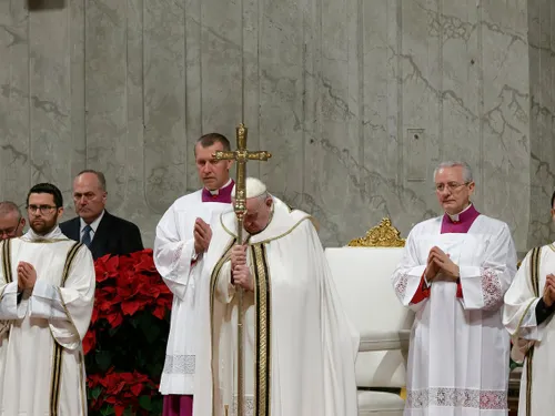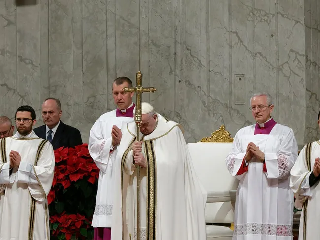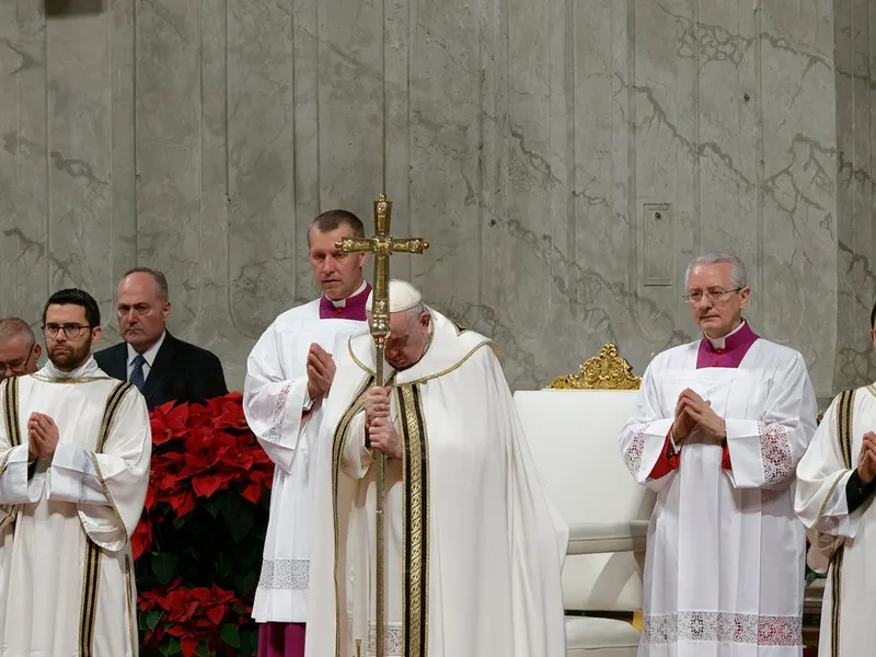 Francisc, care sărbătoreşte al zecelea Crăciun al pontificatului său, a prezidat o slujbă solemnă în Ajunul Crăciunului în Bazilica Sfântul Petru. A fost prima dată când au participat mii de credincioşi, după anii în care asistenţa a fost limitată din cauza COVID. Alte mii s-au aflat afară, în Piaţa Sfântul Petru, într-o noapte relativ caldă.