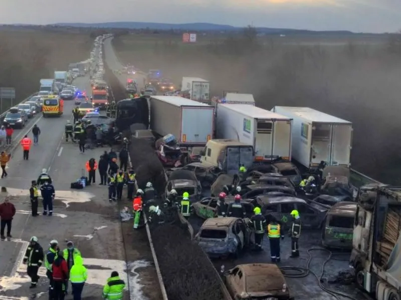 Poliţia anunţă că accidentul s-a produs în jurul orei 14:25 şi în total cinci camioane şi 37 de autoturisme s-au ciocnit pe tronsonul kilometrului 26 al autostrăzii M1, pe sensul de ieşire din Budapesta.
