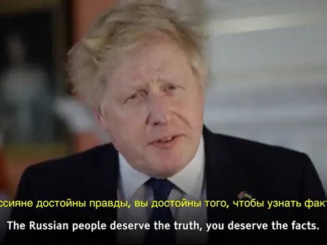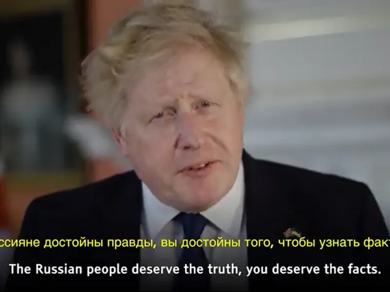 Premierul, Marii Britanii, Boris Johnson a publicat pe reţele sociale un videoclip destinat cetăţenilor ruşi în care spune în limba rusă că trupele ţării comit atrocităţi în Ucraina, precum masacrarea civililor şi violarea femeilor.