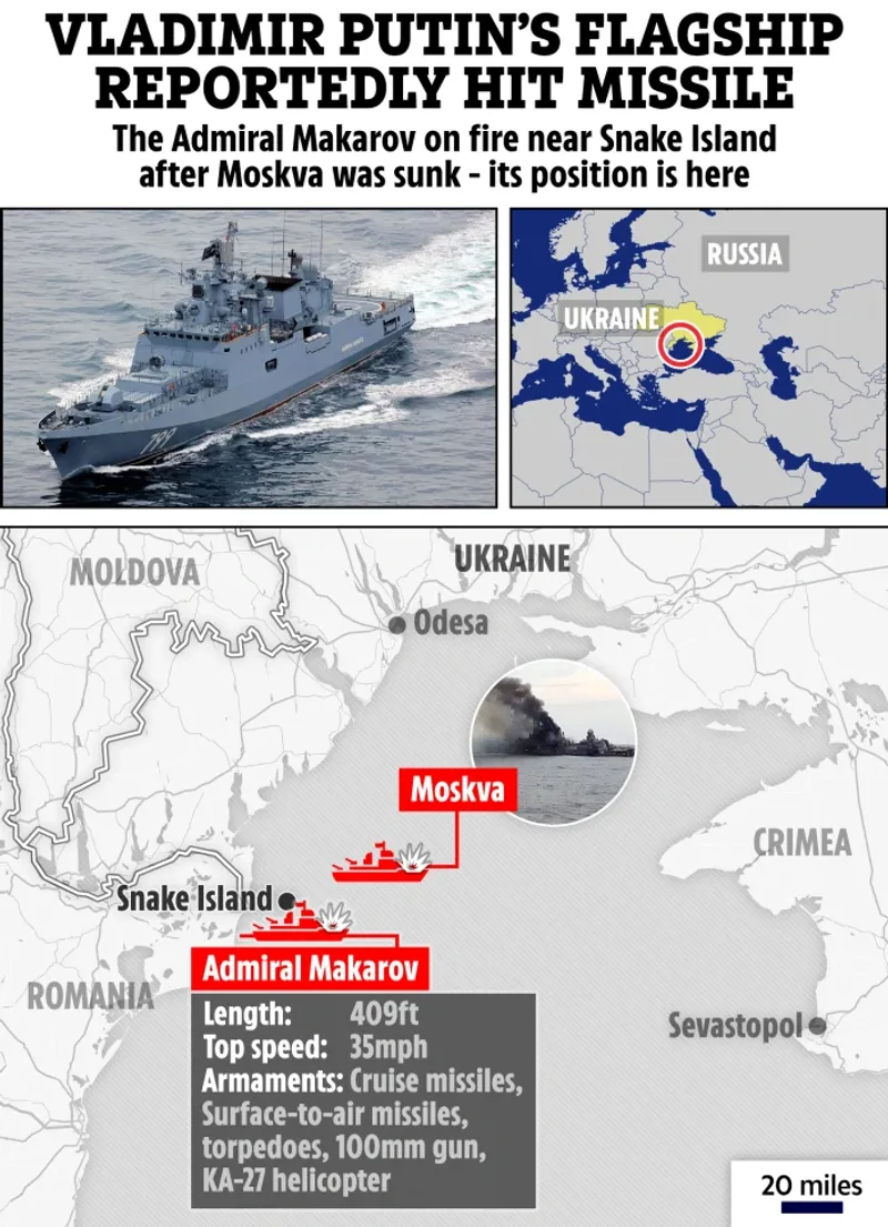 Anton Gherașcenko, un consilier al Guvernului ucrainean și fost ministru, a declarat pe Twitter: „Nava rusă este în flăcări. Se pare că este una dintre cele mai noi nave, Amiral Makarov”.