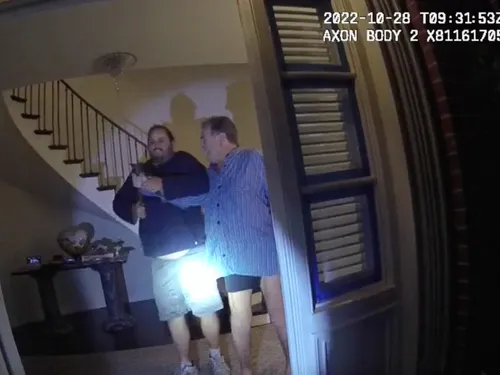 Când uşa locuinţei s-a deschis, potrivit imaginilor de pe body-cam, amândoi bărbaţii sunt cu faţa la poliţiştii de la uşă. Iniţial, ciocanul se află în umbră şi durează aproximativ cinci secunde până când o lanternă arată că DePape ţine mânerul ciocanului cu mâna dreaptă şi strânge cu mâna stângă mâna dreaptă cu care Pelosi apucase capul ciocanului. Lupta nu este evidentă în primele câteva secunde.