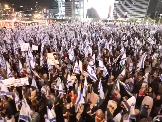 O mulţime compactă de israelieni a ieşit din nou pe străzile din Tel Aviv sâmbătă seara pentru a protesta împotriva reformei justiţiei dorite de guvernul premierului Benjamin Netanyahu, pe care manifestanţii o consideră un atac la adresa democraţiei,