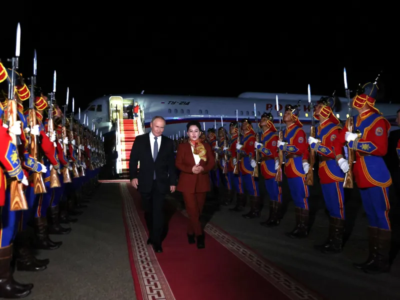 Vladimir Putin a sosit în Mongolia într-o vizită oficială la invitația președintelui Mongoliei, Ukhnaagiin Khurelsukh, pentru a participa la sărbătorile celei de-a 85-a aniversări a victoriei comune a forțelor armate sovietice și mongole asupra militarilor japonezi în luptele de pe râul Halkhin Gol.