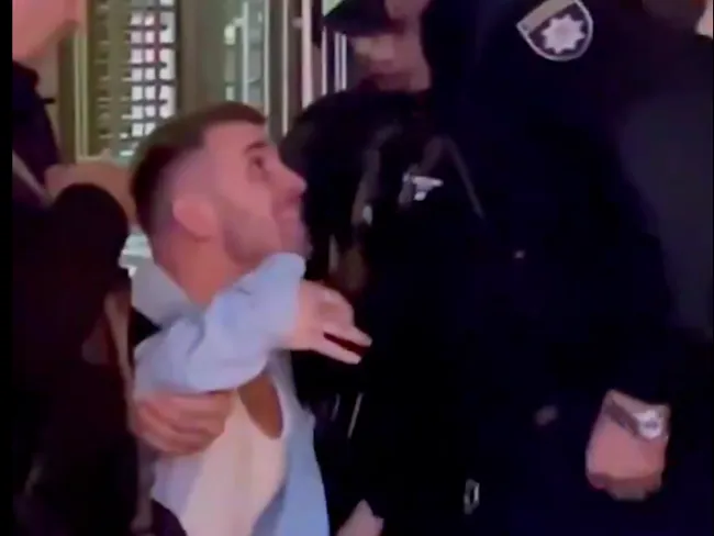 „Plecați de lângă mine!”, a strigat un bărbat către polițiști în timp ce aceștia îl trăgeau spre un birou de recrutare improvizat în fața Palatului Sporturilor din Kiev.