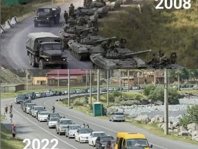 În fotografia de mai sus vedeți același loc în care Rusia invadează Gerogia (2008, sus) și o poză de azi în care rușii fug din țară prin același loc.