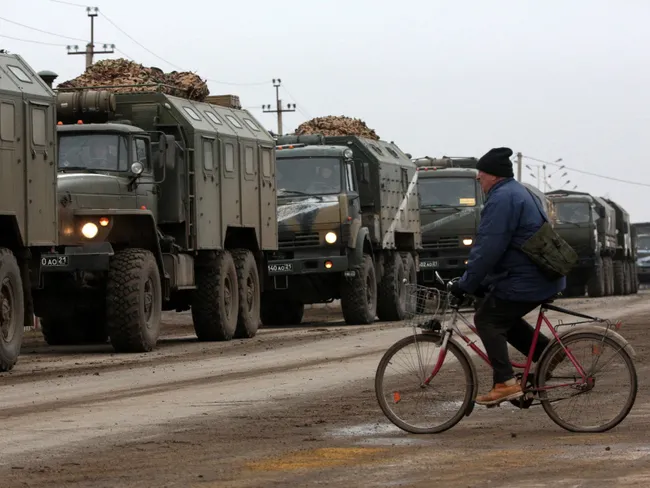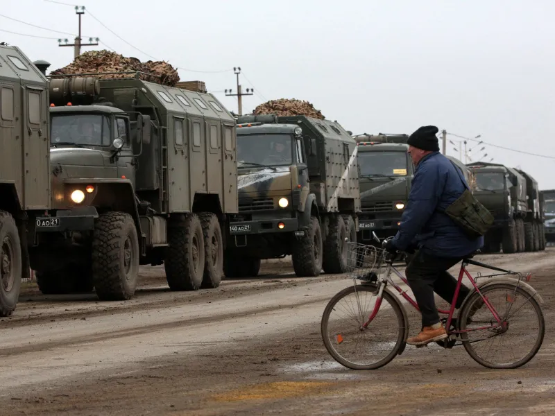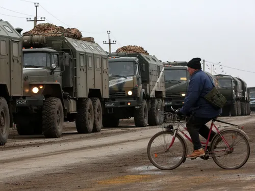 Potrivit martorilor oculari, camioanele, în mare parte URAL, erau însoțite de vehicule ale Inspectoratului de Stat rus cu girofaruri.