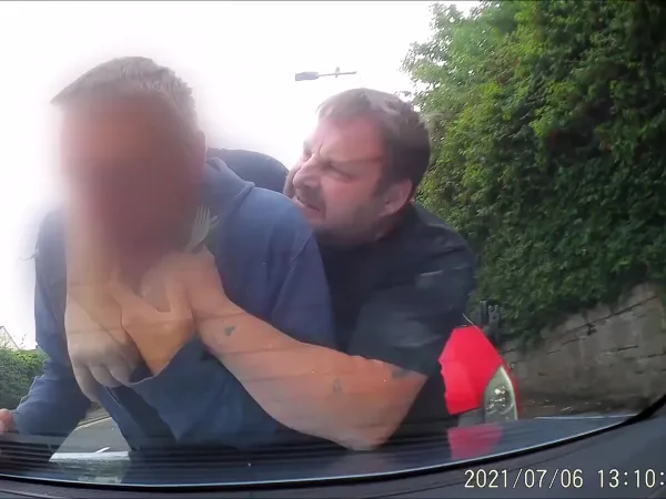 Șoferul unei dubițe a fost amendat după ce a fost filmat de o cameră de bord în timp ce agresa un bărbat și îi punea o furculiță de plastic la gât, în urma unui incident auto.