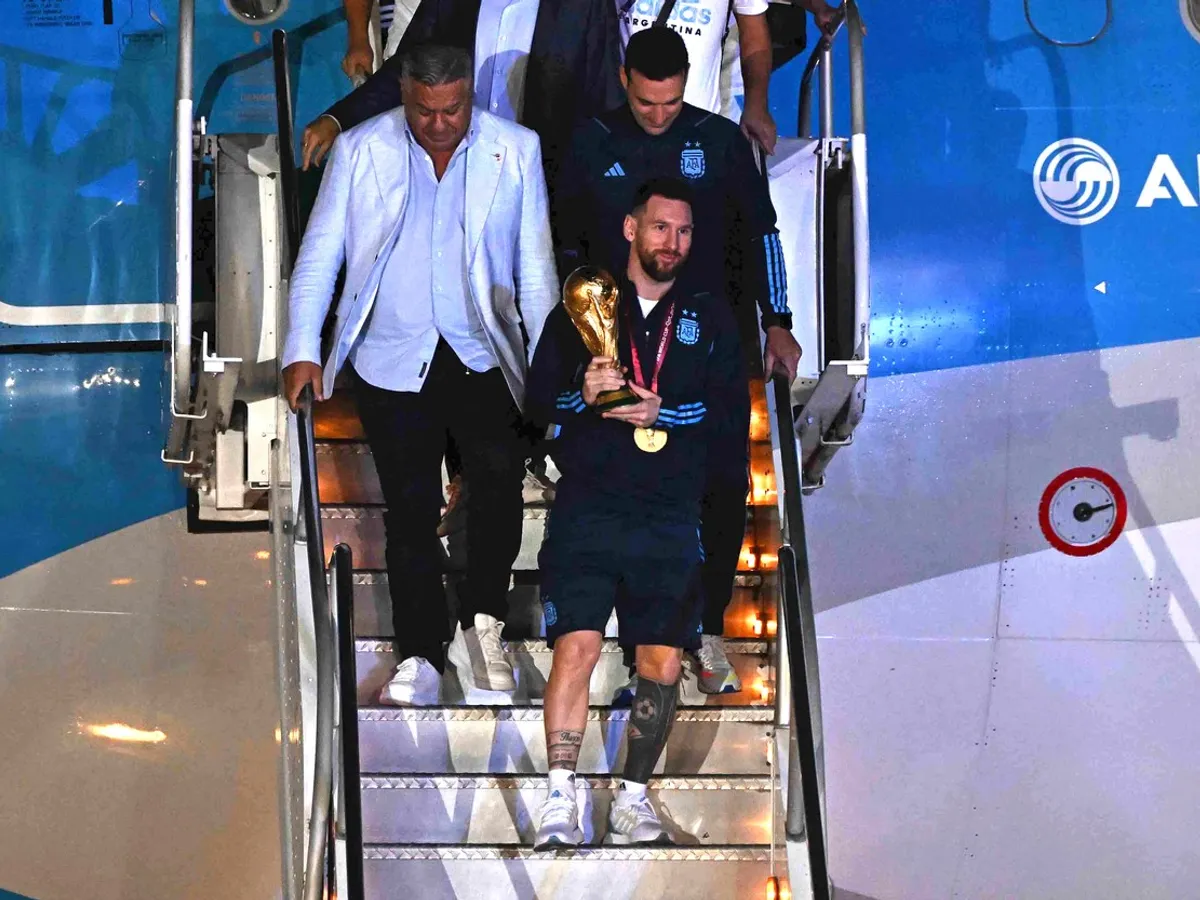 Căpitanul Lionel Messi a coborât primul din avion, ținând în mână trofeul de aur, urmat de echipa sa triumfătoare pe covorul roșu de la aeroport, întâmpinat de reporteri, oficiali și o formație live.