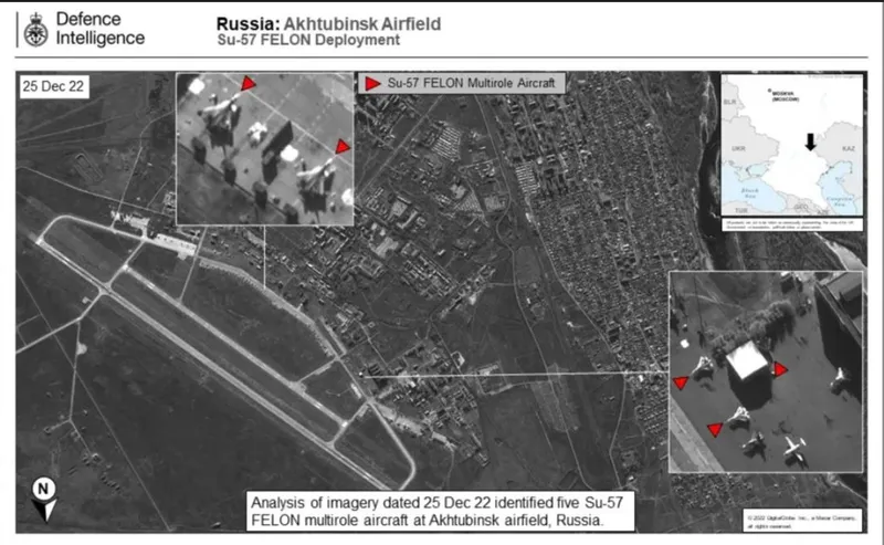 Pe canalul său de Twitter, Ministerul britanic al Apărării oferă de asemenea un exemplu de imagine din satelit "disponibilă în comerț", datată 25 decembrie, care arată cinci avioane Felon la baza aeriană rusă de la Ahtubinsk, în apropiere de Astrahan, în sudul Rusiei.