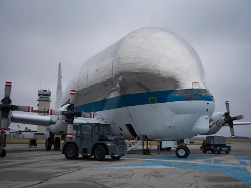 Aeronava NASA cu o formă unică, ultima de acest fel, și-a făcut o apariție rară la Marshall Space Flight Center din Huntsville pentru a livra un adaptor de etapă Orion de la Centrul Spațial Kennedy, ca parte a viitoarelor misiuni Artemis către Lună.
