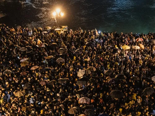 În ajunul lecturii finale de către Parlamentul georgian a „legii lui Putin”, folosită pentru a viza criticii conducerii, sute de mii de manifestanți se adună în centrul Tbilisi pentru a împiedica adopatarea legii.