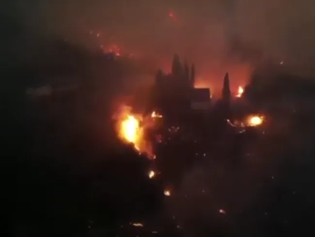În imaginile video surprinse în cursul nopţii se pot vedea flăcările care ameninţau casele şi se ridicau dintre copaci, în timp ce incendiul se extindea pe mai multe fronturi, alimentat de vântul puternic.