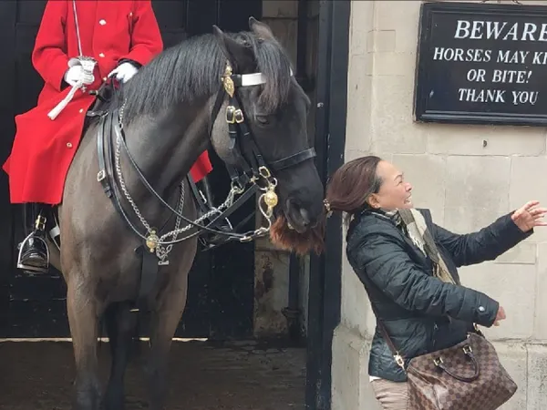 Un videoclip a surprins momentul când calul din Garda Regelui de la Palatul Buckingham apucă de păr o turistă care s-a apropiat prea mult, în timp ce călărețul stă impasibil, cum cere regulamentul.