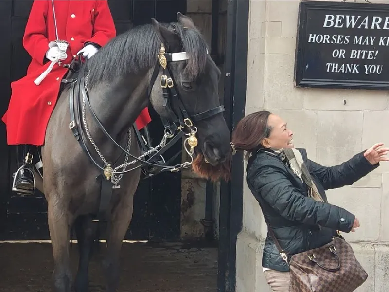 Unui cal al Gărzii Regelui de la Palatul Buckingham nu-i place să se fotografieze cu turiștii. Aceștia sunt avertizați să nu se apropie, dar mulți nu țin cont și o pățesc.