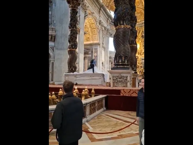 Sub privirile consternate ale turiștilor și paznicilor, un tânăr s-a urcat pe altarul principal al Bazilicii Sfântul Petru de la Vatican și a dărâmat cu piciorul mai multe sfeșnice din 1865, spărgându-le.
