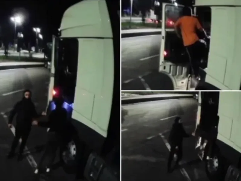 Vezi AICI clipul în care un șofer român de TIR s-a trezit cu doi hoți în cabină.
