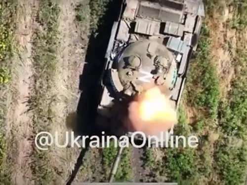 Lansată din dronă, grenada intră după un ricoșeu direct în interiorul unui tanc T-62 rus a cărui trapă este deschisă. Imaginile au fost surprinse din dronă.