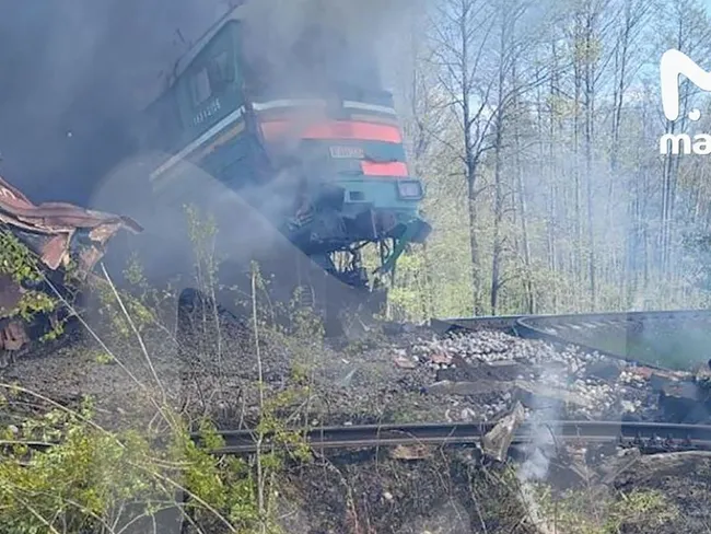 Imaginile video realizate la locul unei explozii arată o deraiere a unui tren de marfă, în Briansk, după ce locomotiva a deraiat. Zeci de vagoane sun tdistruse și ard mocnit, în timp ce echipajele de urgență sting mai multe incendii.