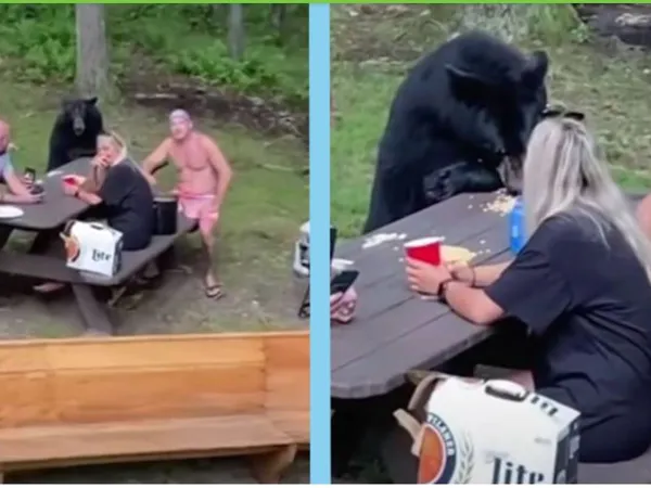 Un urs sălbatic este filmat în timp ce se alătură unei familii, la masă, părând unul „de-al casei”. Întâmplarea a avut loc în Deeρ Creek, Maryland.