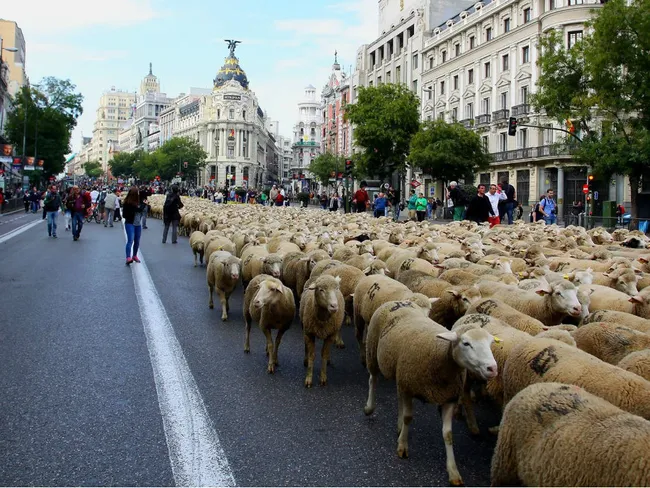 Localnici şi turiştii s-au aliniat de-a lungul drumului pentru a privi cum mii de oi au mers pe străzile din Madrid, iar clopotele de la gâtul animalelor au oferit un fundal sonor zgomotos.