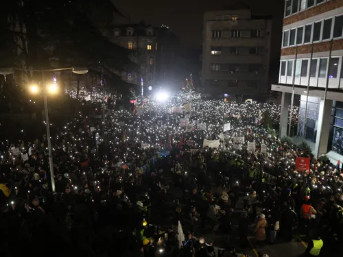 Un protest masiv a avut loc, vineri seara, în capitala Serbiei. Zeci de mii de oameni au ieșit în stradă la Belgrad pentru a cere imparțialitatea televiziunii naționale, RTS, și a comemora cele 15 victime ale prăbușirii acoperișului unei gări în noiembrie 2024.