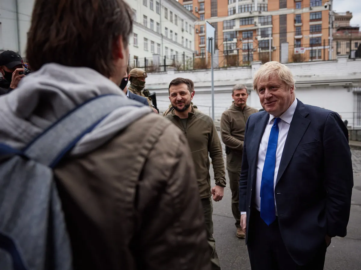Johnson şi Zelenski trec printre oameni, pe o stradă din Kiev, iar în jurul lor se văd inclusiv baricade. Cei doi salută oamenii pe lângă care trec şi le fac cu mâna.