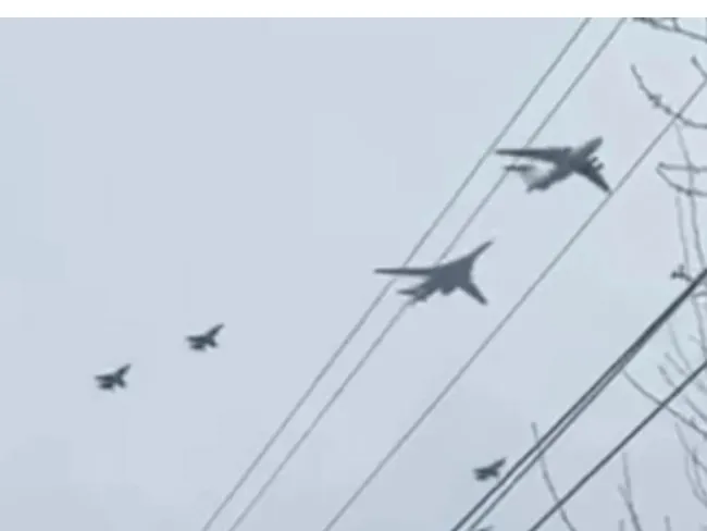 Videoclipurile au surprins astăzi patru avioane, trei care însoțeau un bombardier nuclear, peste regiunea Kaluga, între Moscova și granița cu Ucraina.
