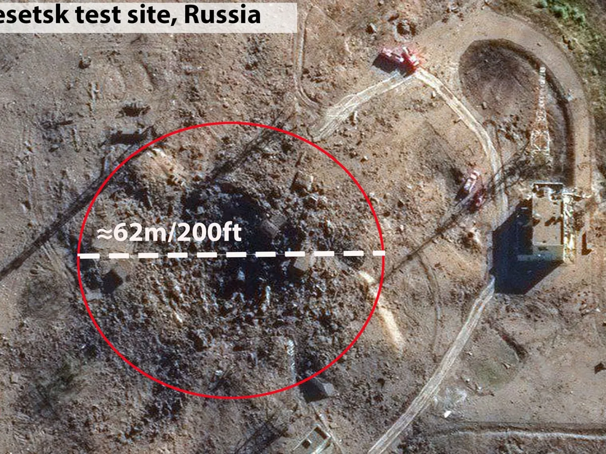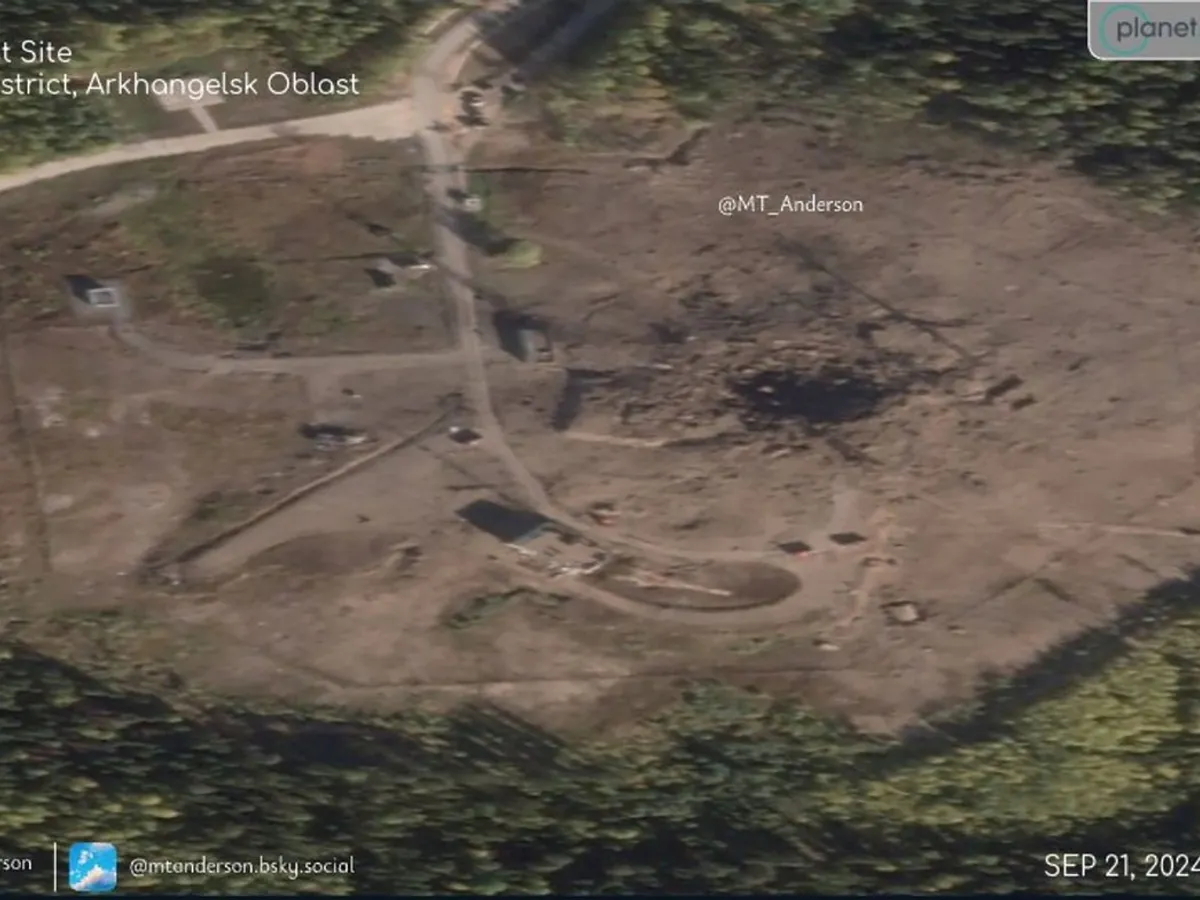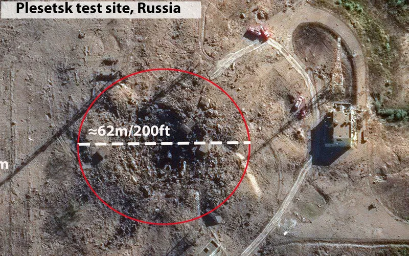 Zonă contaminată după explozia rachetei SATAN II în Rusia. Recent, un test al rachetei balistice intercontinentale RS-28 „Sarmat” s-a încheiat cu o explozie spectaculoasă în siloz, lăsând în urmă un crater de aproximativ 62 de metri în diametru.